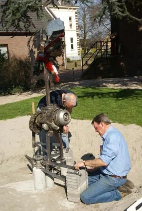 Mevr. Wiebosch, destijds burgemeester van Jacobswoude vroeg mij een ontwerp te maken voor een oorlogsmonument. In de gemeente werkplaats lagen overblijfselen van het vliegtuig. Die mocht ik gebruiken: een propellermotor en een propellerblad. Dat inspireerde mij omdat er een mooie kronkel in het blad zit. Voor mij lijkt het een hand die iets wegslaat.